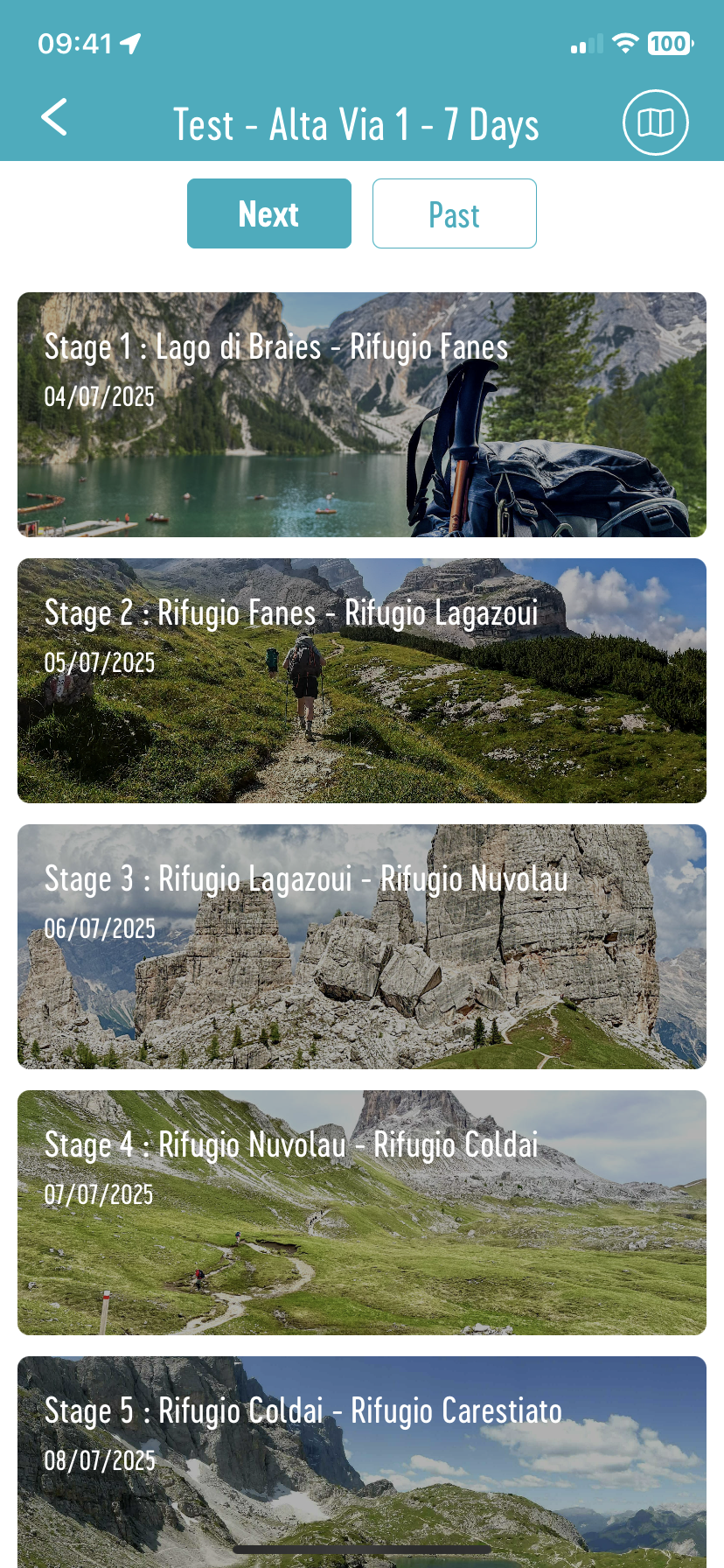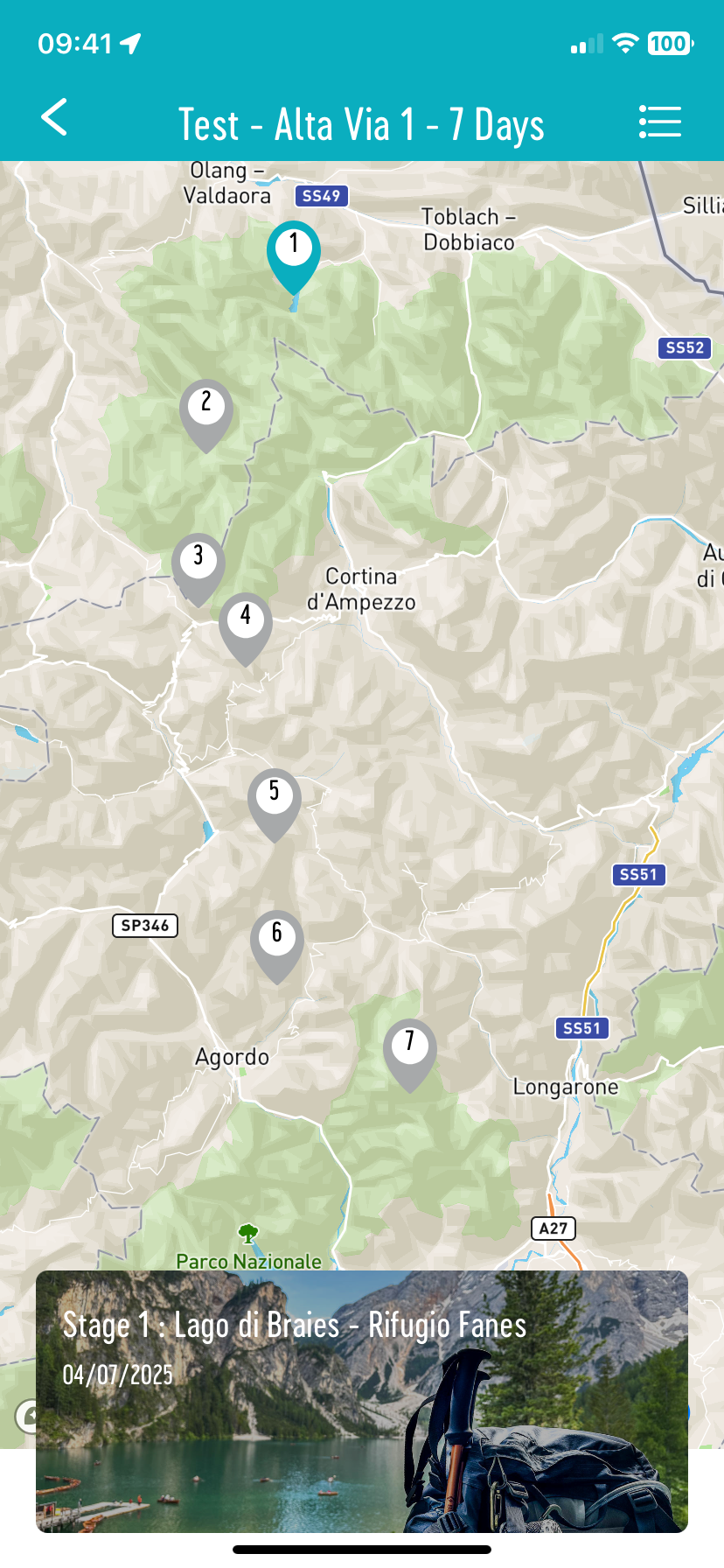 - Trip Map: This is the trip general map, showing the route of all the stages along the way. By clicking on the numbered markers, the corresponding stage appears at the screen’s bottom. Clicking on them takes you back to the stage details.