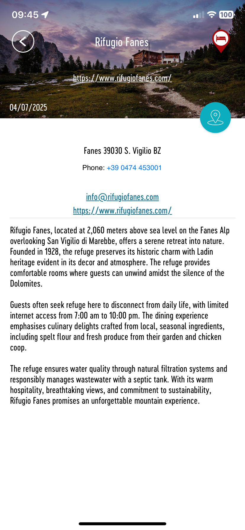 - By clicking on the accommodation you will be able to see a description of the refuge/auberge/hotel with any relevant information you may need to know for your stay. Along with the contact details, if you are running late and expect to arrive at the refuge later than 18:00pm please call them to let them know. You can also pin point them on the map and have a direct link to their website.