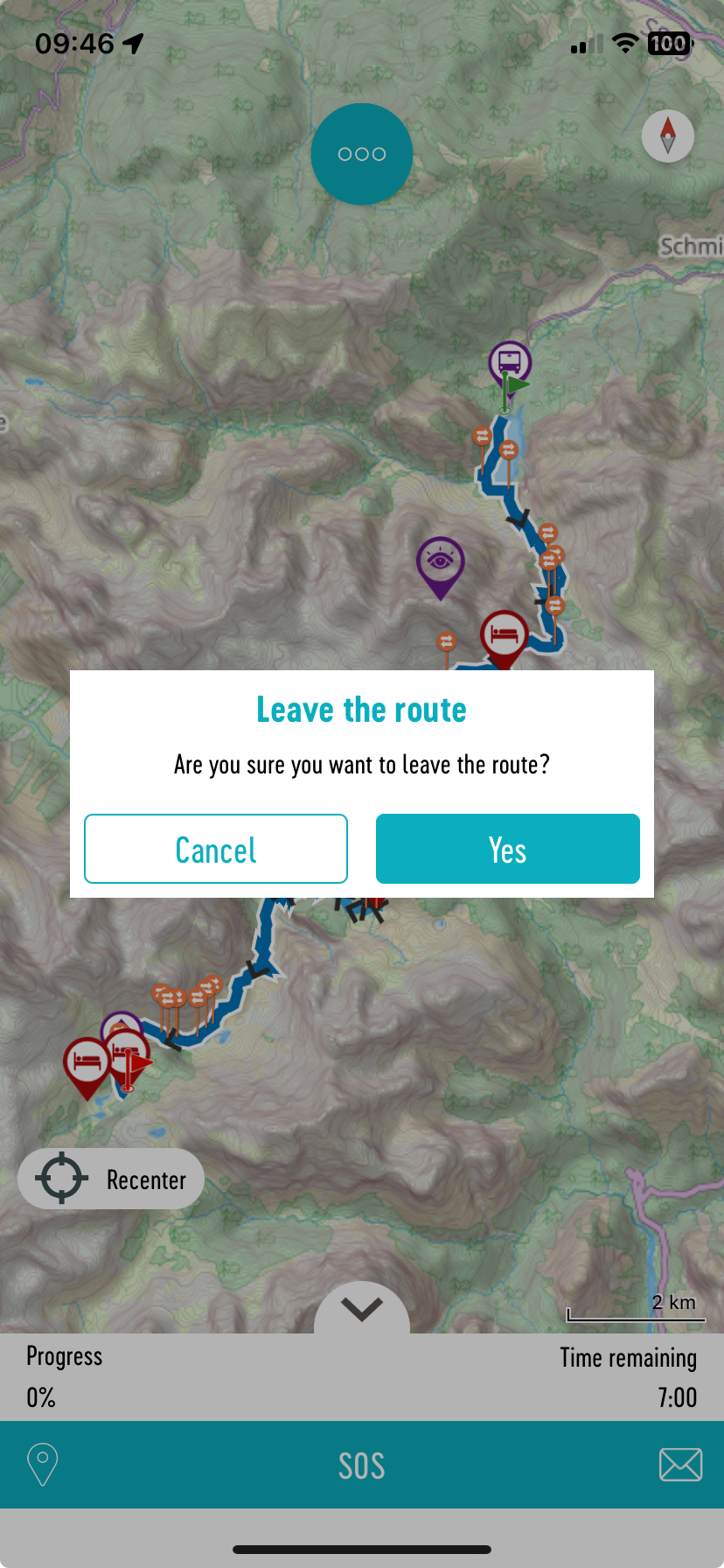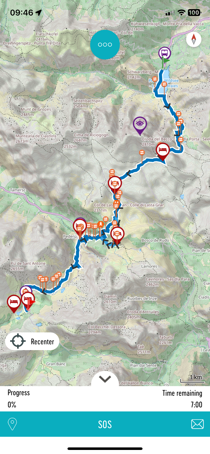- If you’re at the start of the hike, press the ‘flag icon’, walk a few meters and the GPS will locate you and magnetise you to the track. An audible alert tells you that guidance is starting: let yourself be guided!