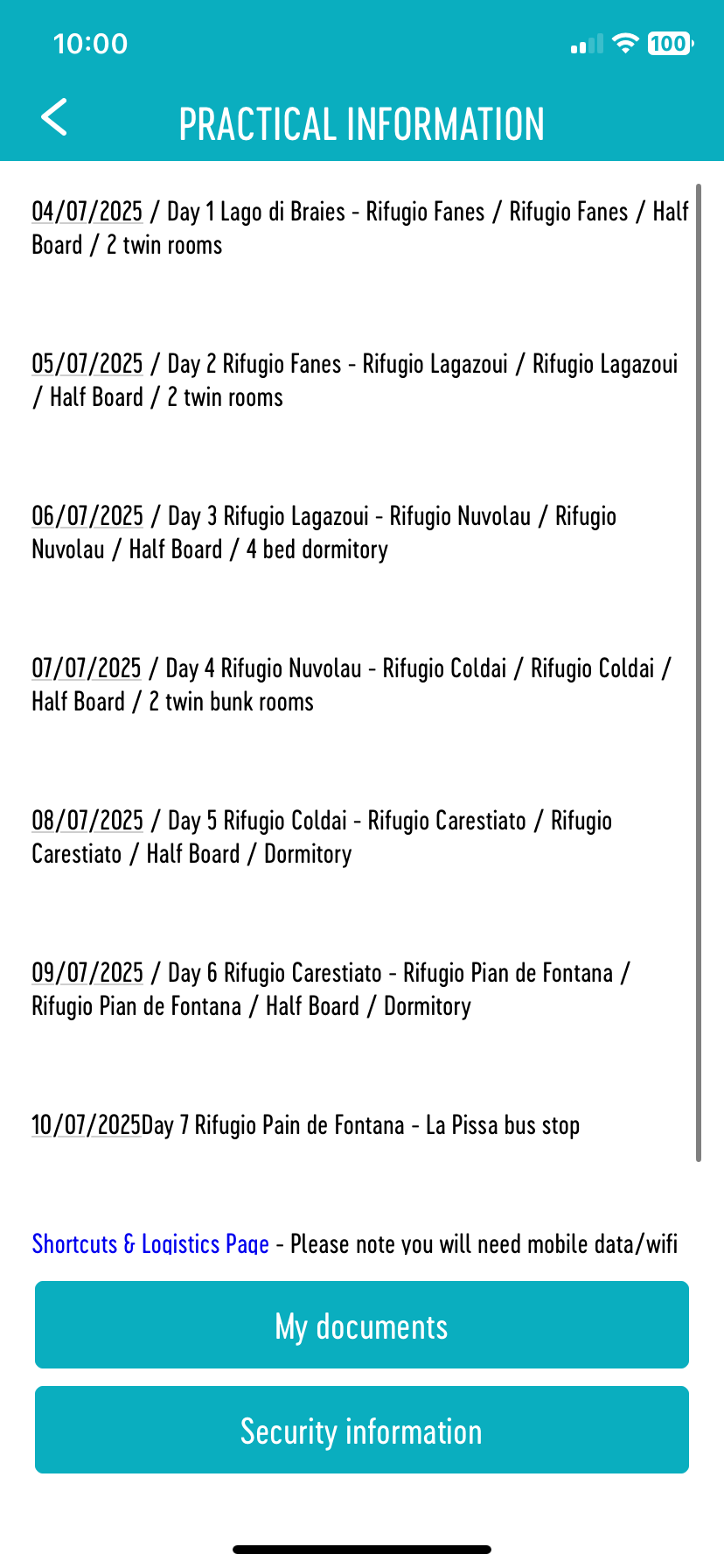 Note: Our shortcuts and logistics page is not available in the documents section, as timetables are typically released in June and require updates. This means it cannot be accessed without data or WiFi. Please open the page a few days before your trip to download any timetables you may need, or check the information using mobile data along the route or WiFi the night before for the following day.